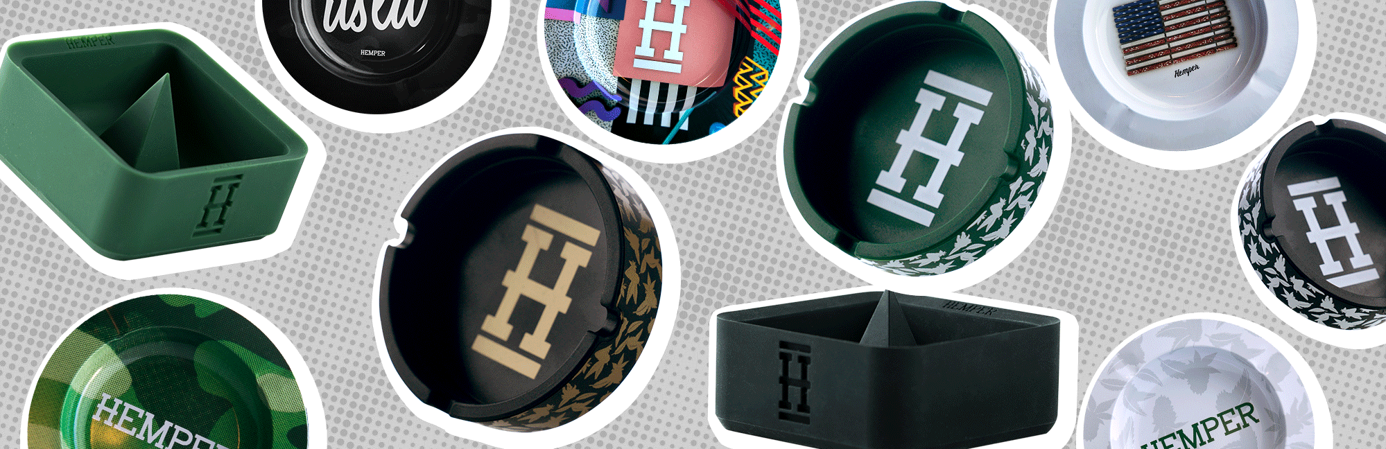 - Hemper Cannaflage “Asher” Ashtray in Black and Gold, Black and White — The Hemper Silicone Ashtray’s modern look will brighten up any smoking space. It’s made of high-quality heat-resistant silicone, so it can ensure your hottest joints and smoldering ash. The silicone design means that it is both flexible, rugged, and durable. The symmetrical sides come with four grooves to share with your friends.
