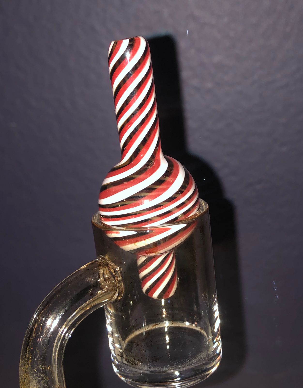 Add a swirl of festive flair to your dabs with the Candy Stripe Bubble Carb Cap. Crafted from durable borosilicate glass, this carb cap features a vibrant red and white candy stripe design that enhances both airflow control and aesthetic appeal. Its bubble shape helps retain heat and push concentrates evenly for smoother, more flavorful hits. A perfect accessory for any holiday-themed setup or year-round sweet sesh.