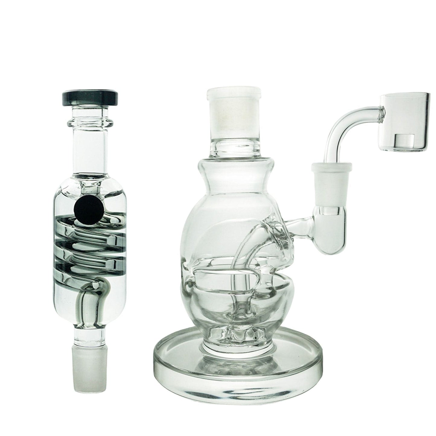 Iconic mini dab rig design that combines function and glycerin cooling power. An improved version of the classic fab-egg dab rig mold, Freeze Pipe's version increases air flow and brings the largest base to the mini rig market. A percolator in the bottom chamber begins filtration, while connecting arms transfer water and smoke back-and-forth between the top and bottom chamber. This action further merges hot smoke with cool cleansing water to improve smoothness. Enjoy stout cooling power, intense flavor and ease of use with this pocket sized mini rig.