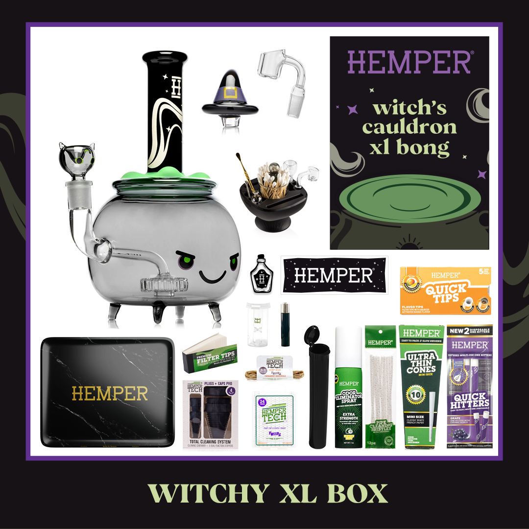 Conjure your next session with the Cauldron XL Bong from HEMPER, a larger than life piece brewed for bold hits. Designed to resemble a witch’s bubbling cauldron, this XL bong features a powerful showerhead percolator and wide, stable base. Packaged in the Witchy Box, it includes curated accessories to complete your spooky setup. Perfect for Halloween or anyone who loves a little magic with their smoke.