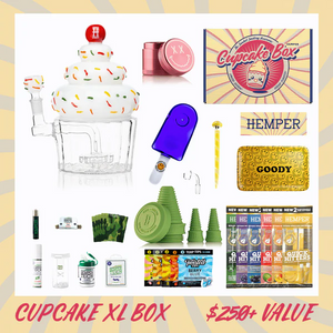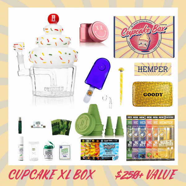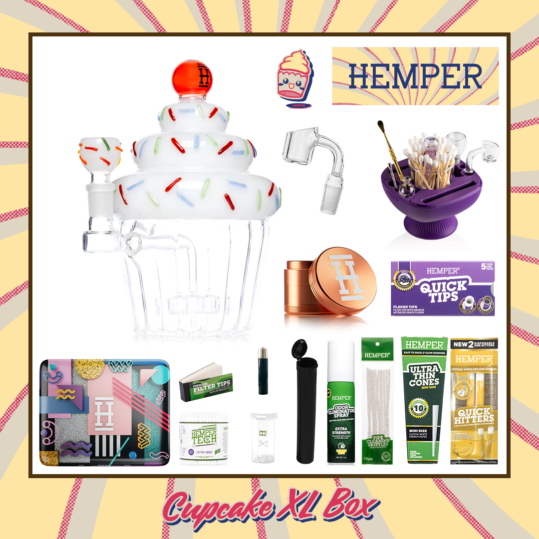 Get ready to light up and indulge with the Cupcake XL Bong Box. This deluxe bundle features the sweet and playful Cupcake XL Bong, topped with colorful sprinkles and a cherry shaped mouthpiece. Paired with flavorful tips, a high quality grinder, stylish rolling tray, and all the Hemper essentials, this box is baked to perfection. It is everything you need for a fun and flavorful smoke session, delivered in one tasty looking package.