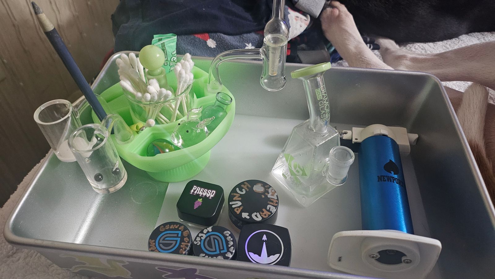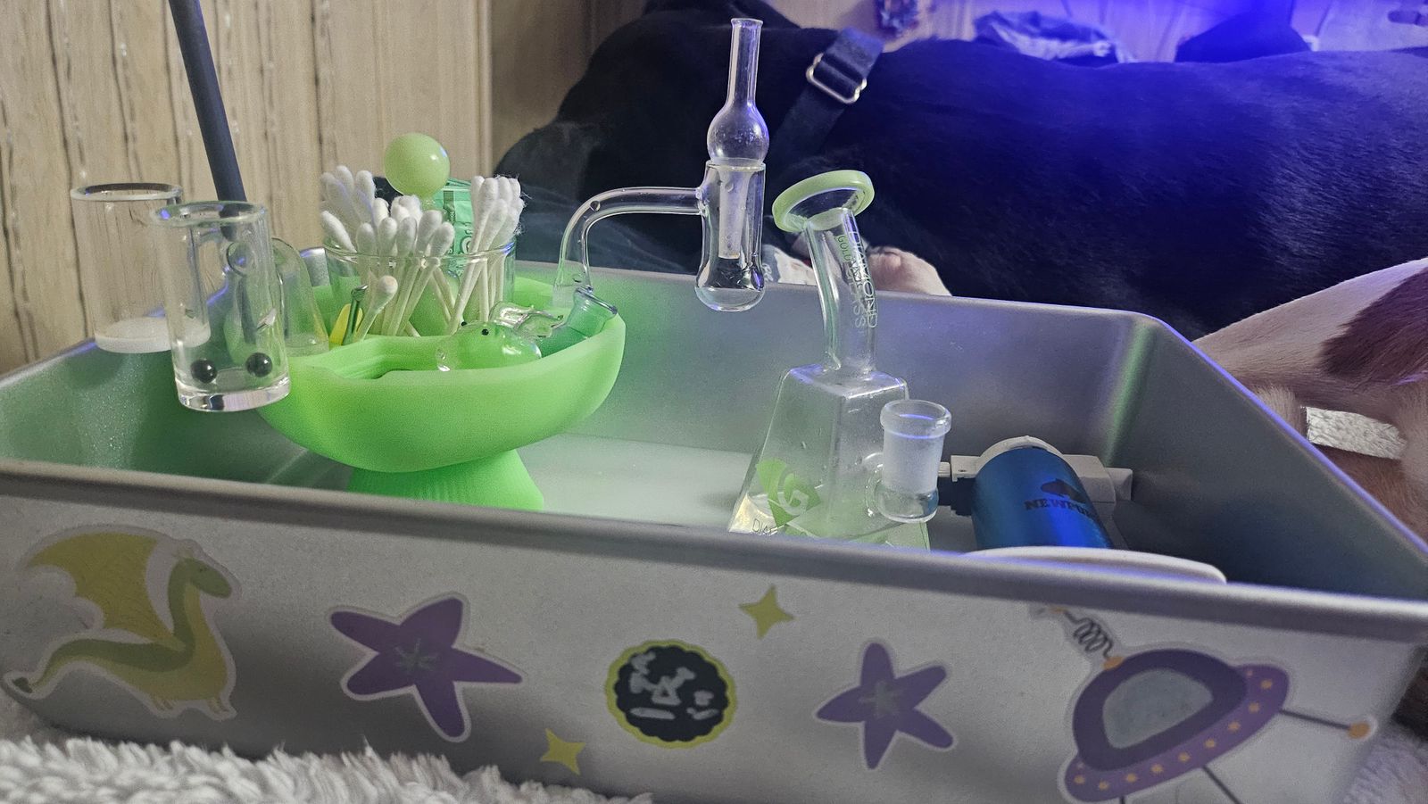 We have a dab tray that we carry all around the house, and this keeps everything in one, non-slip place--- no glass to slide around into the other glass, and the glow in the dark matches our slimy theme!