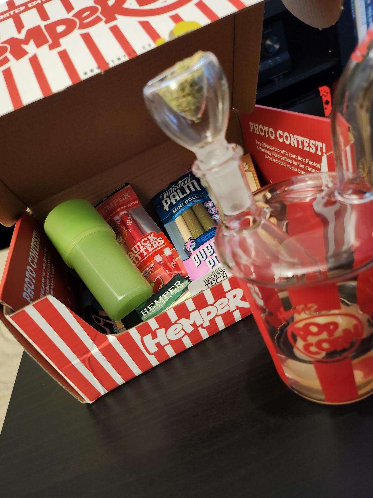 Love the hemper keeper grinder plus multiple compartments for greenery. The mini bong is adorable and the little popcorn kernel at the bottom makes the whole thing. The tray was so cute too.