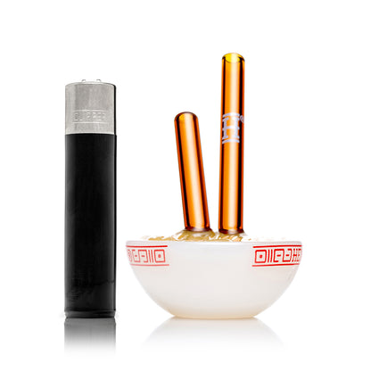 A classic ramen bowl reimagined for the perfect on-the-go smoking session. Part of our Ramen Family Collection, this glass hand pipe features a textured noodle top and a chopstick mouthpiece. Quick, convenient, and always satisfying!