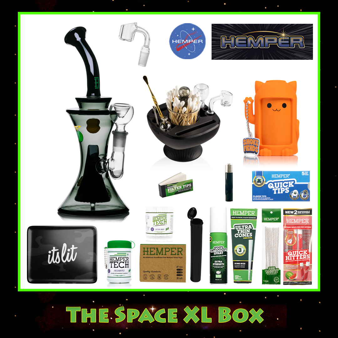 Inside, you will also find a full set of essentials including a quartz banger, themed rolling tray, odor spray, cleaning supplies, glass filter tips, pre rolled cones, and exclusive HEMPER accessories. Whether you are looking to explore the stars or stay grounded with smooth hits, the Space XL Box is your launchpad to an unforgettable session.