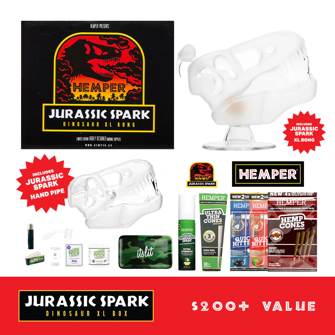 The Jurassic Spark XL Bong Box is a limited edition bundle featuring the XL bong with a 45 degree 14mm banger, matching hand pipe, exclusive dino stickers and premium smoking accessories. Complete with rolling tray, filter tips, quick hitters, pre rolls, odor eliminator and more, this collectible set delivers everything you need for a prehistoric level sesh.
