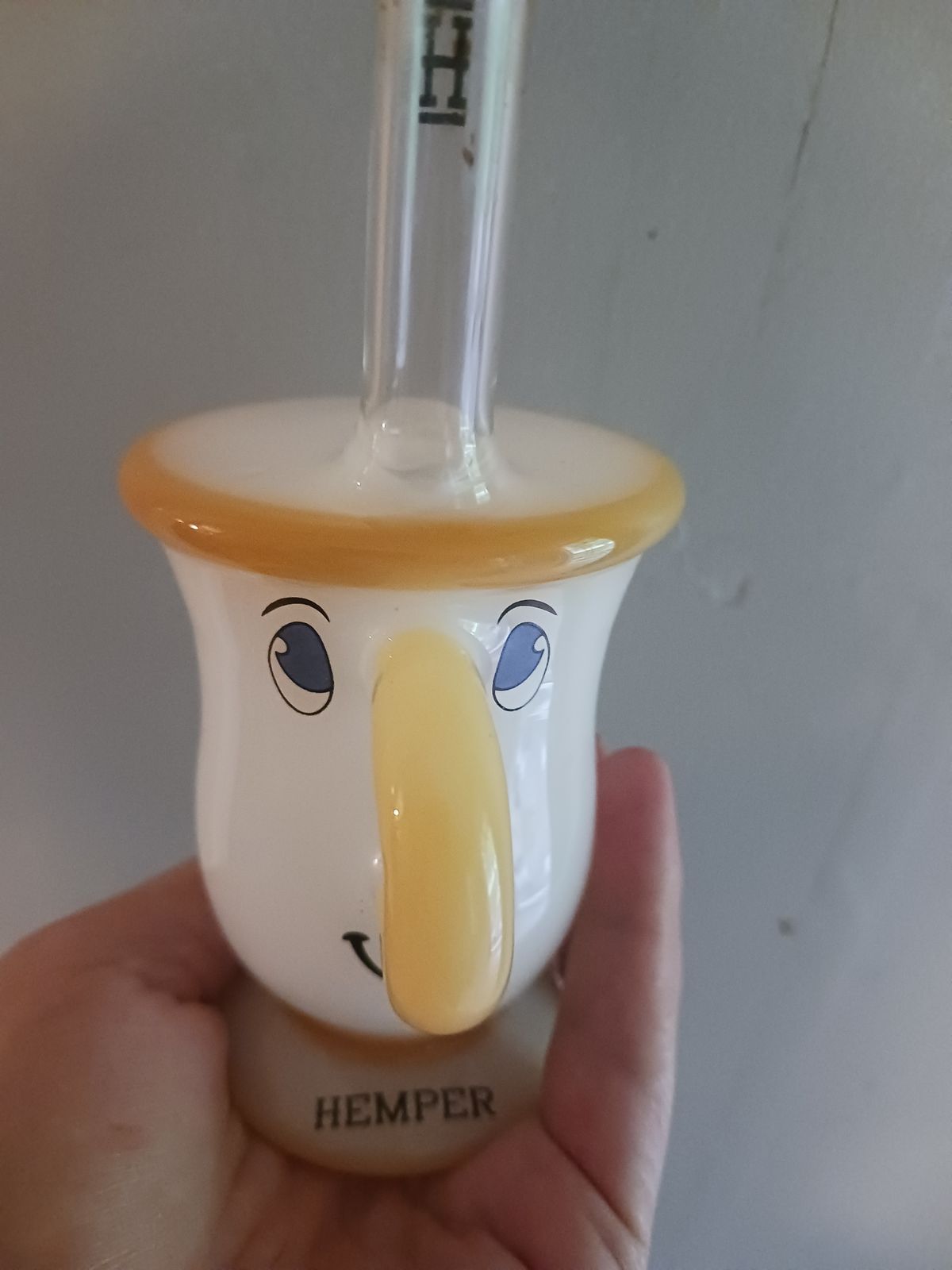 He's really adorable. Would've been so much cuter if the would've incorporated the "chip" on it but I understand why not. He's small but that's okay with me. I'd say he's as tall as the biggest iPhone out rn. Can't wait to use him. I also got the carb cap and the teacup bowl &' I can't wait to make my next purchase