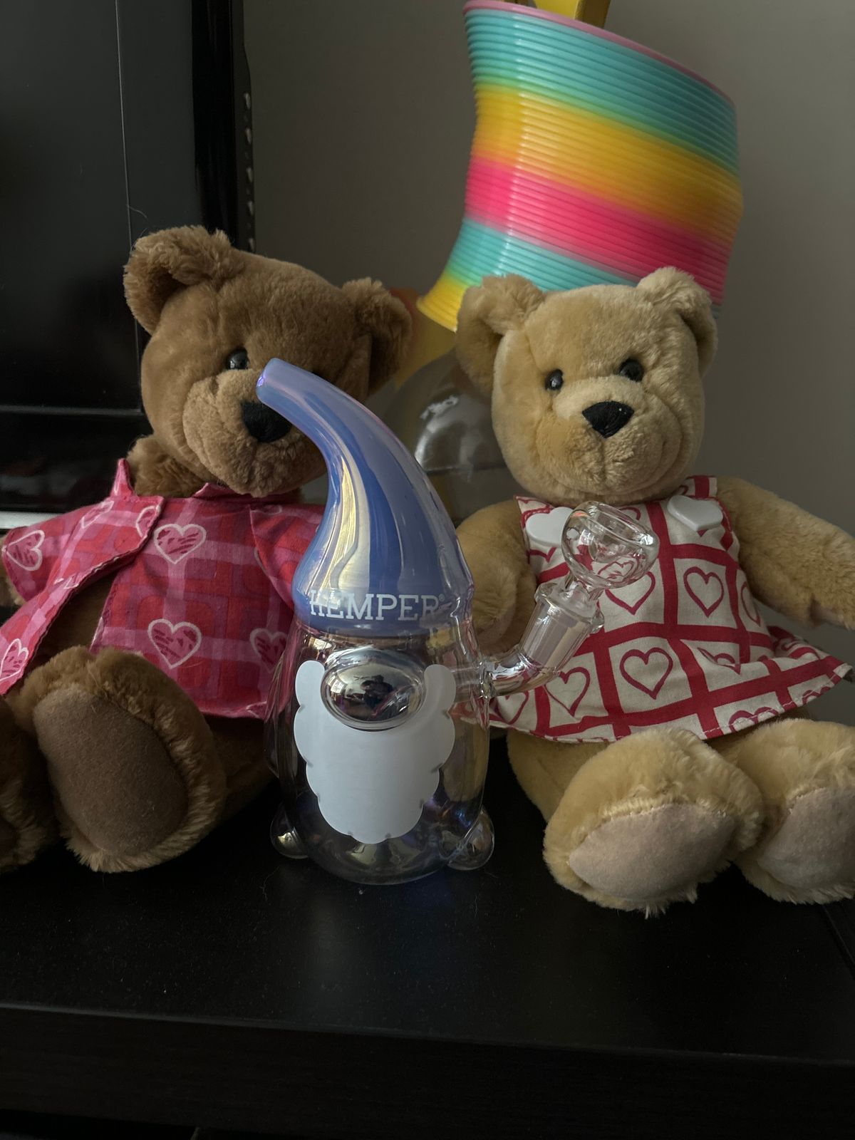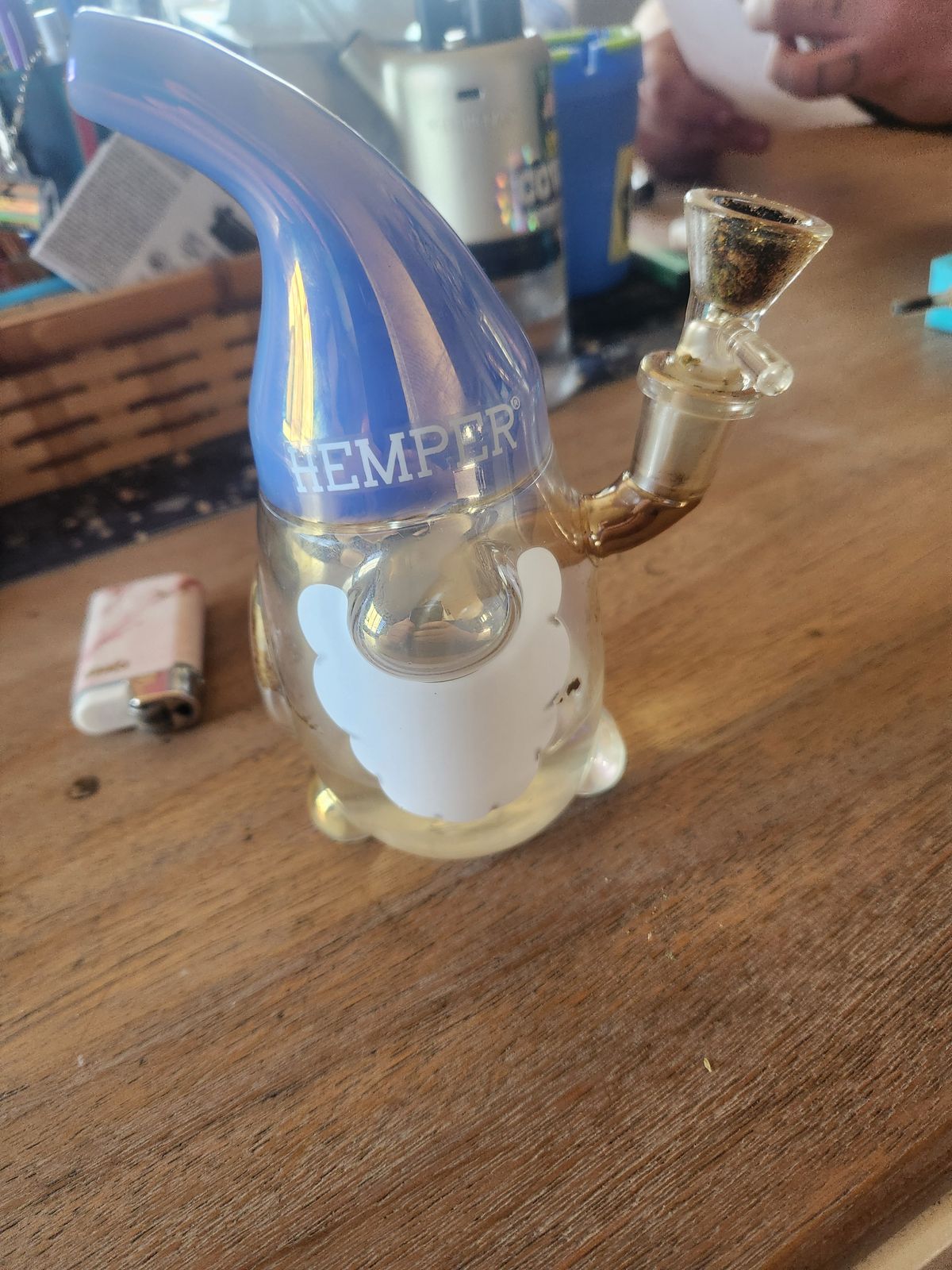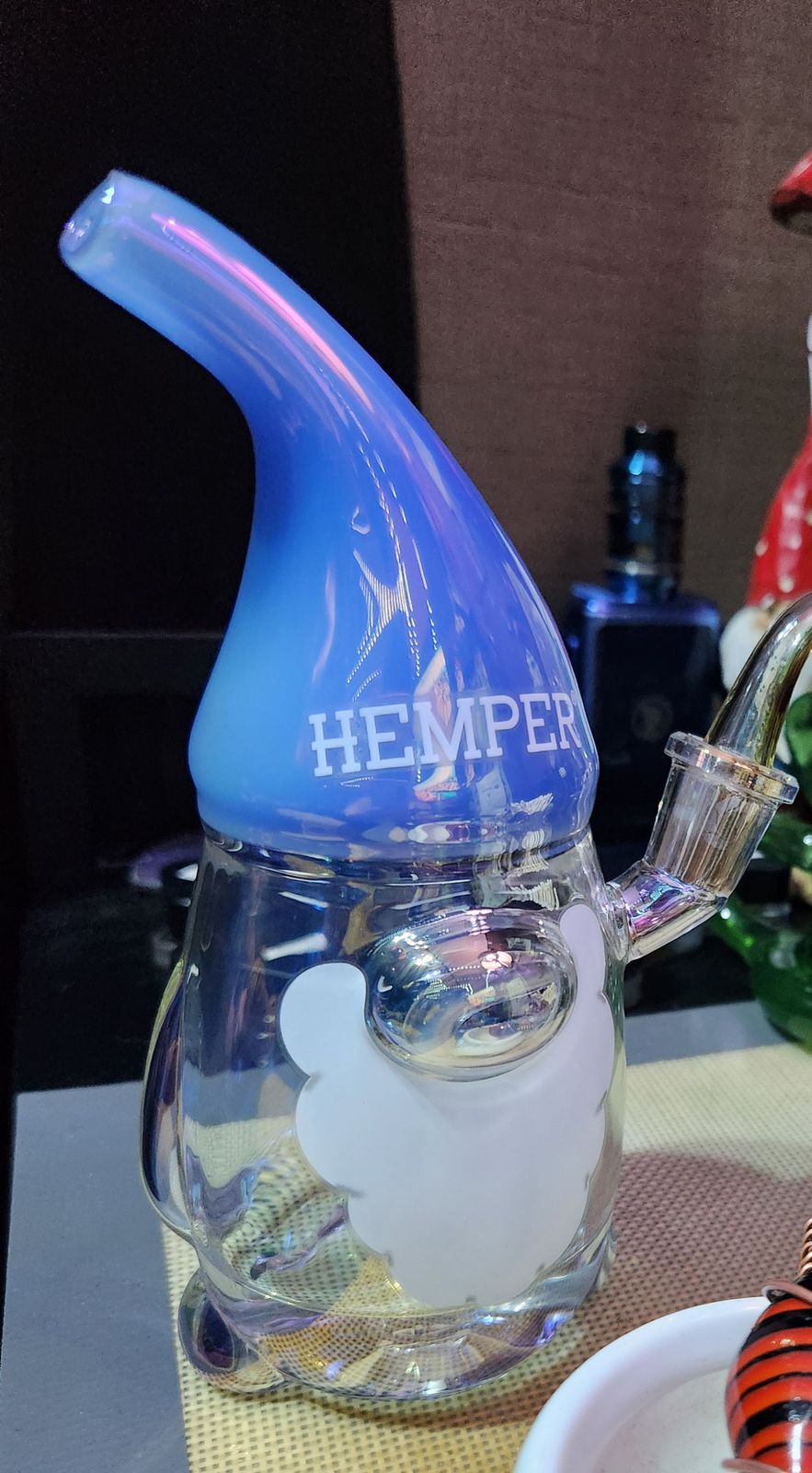 Say hello to the life of the party, the Trippy Gnome Bong! Sporting a dazzling blue iridescent hat and a fluffy white beard decal, this gnome-shaped glass piece is ready to rock your smoke sessions. With the bowl nestled in one of his arms, this gnome isn't just for show – he's your trusty smoking sidekick! Let the psychedelic vibes flow with every hit!