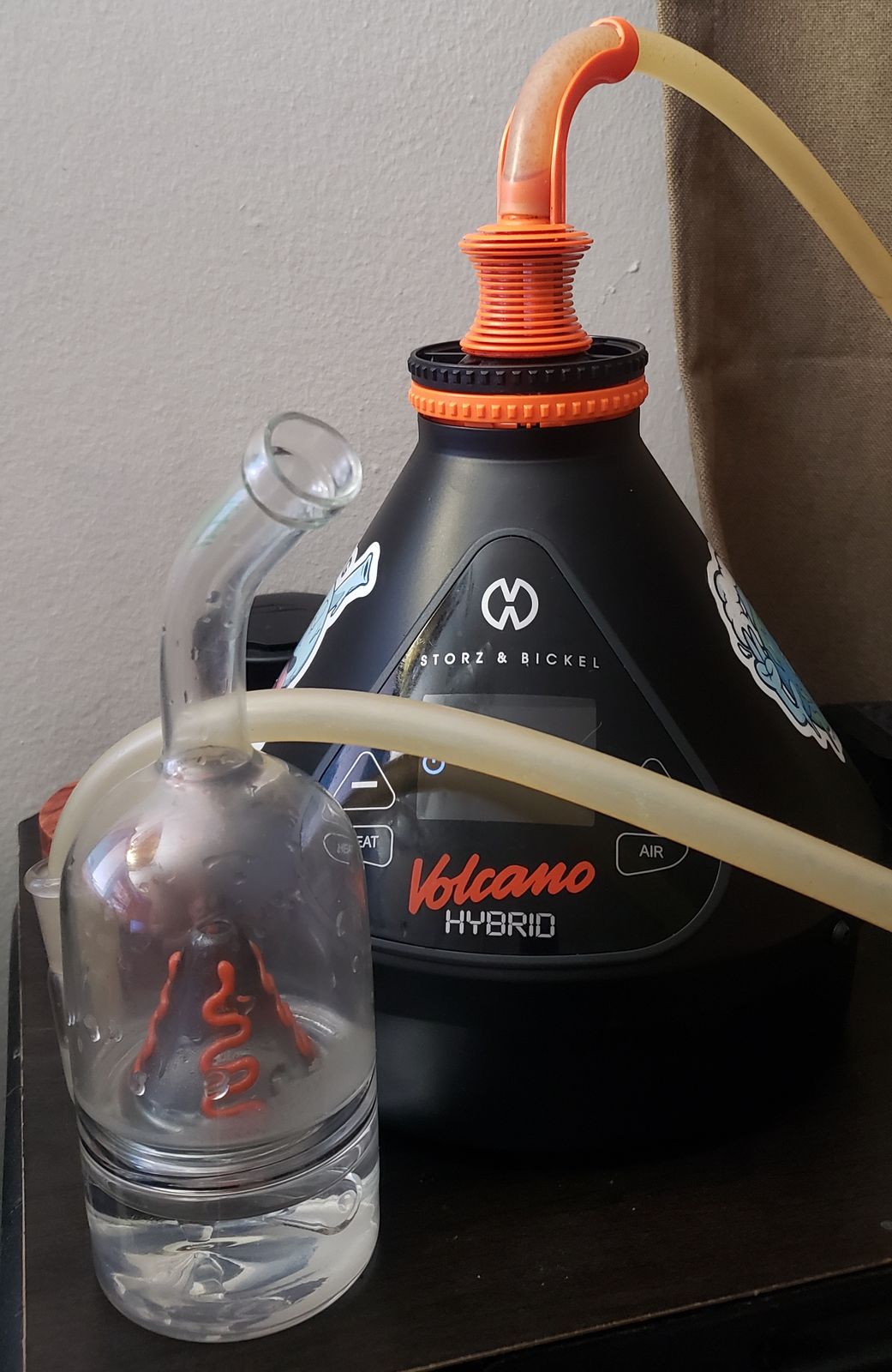This little guy has become my favorite piece to run my Storz & Bickel Volcano through. This way I can rip my volcano while I rip my volcano... Stupid jokes aside it's the ideal pairing. The stock whip from the volcano slots into this bong without the need for an adapter, and while I have an adapter it slides off the whip and is more trouble than it's worth.